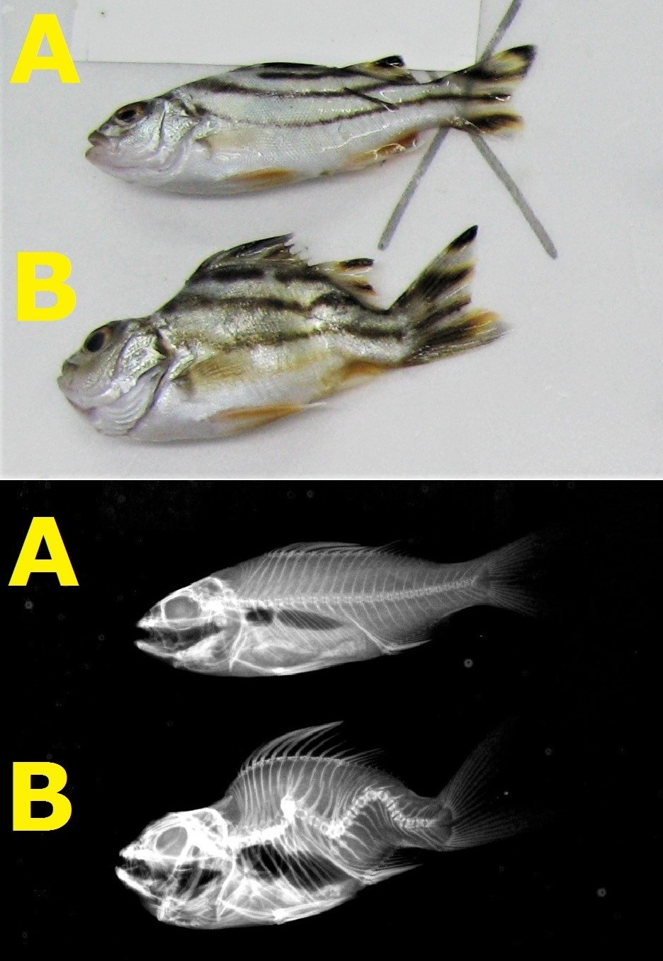 正常花身鯻(A)與花身鯻畸形魚(B)的外觀照片(上)與X光照片(下)(圖片來源:臺灣魚類資料庫)